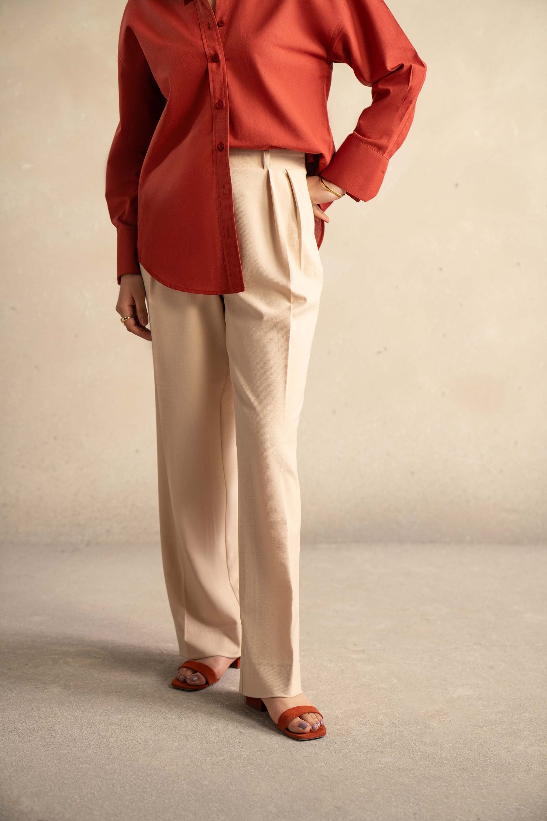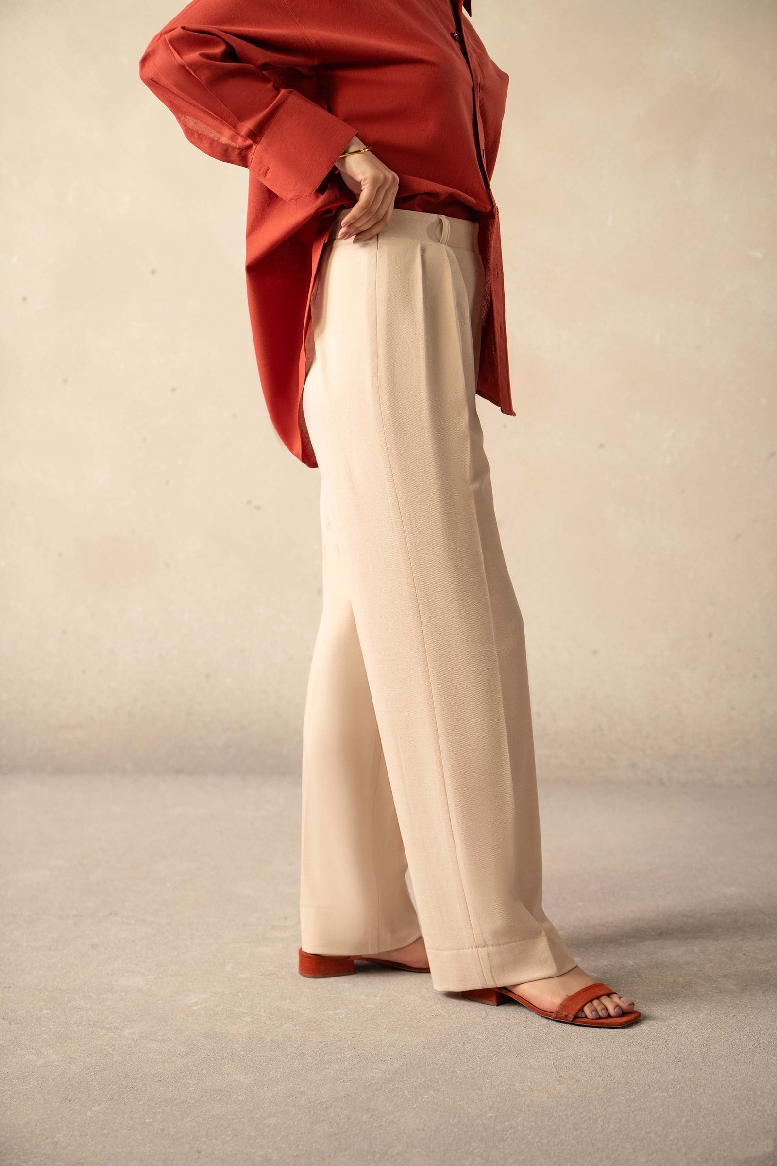 Beige Wide Leg Trouser With Pleats